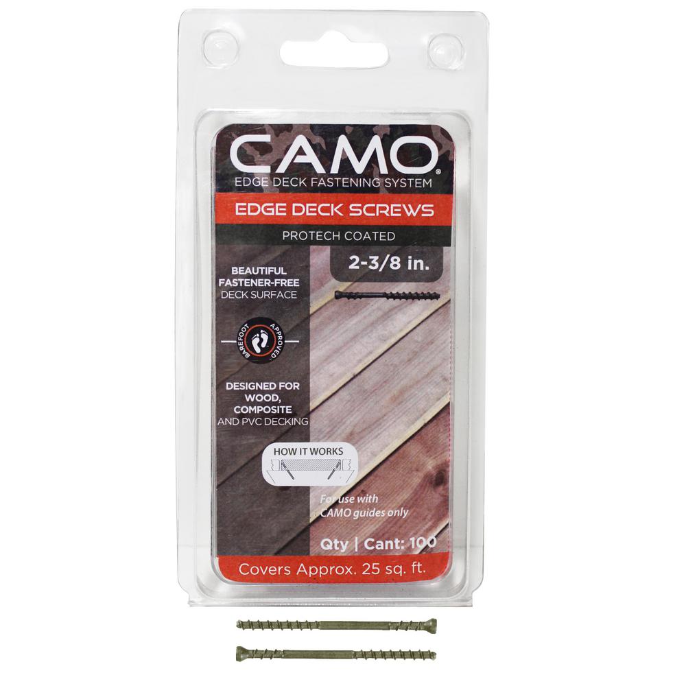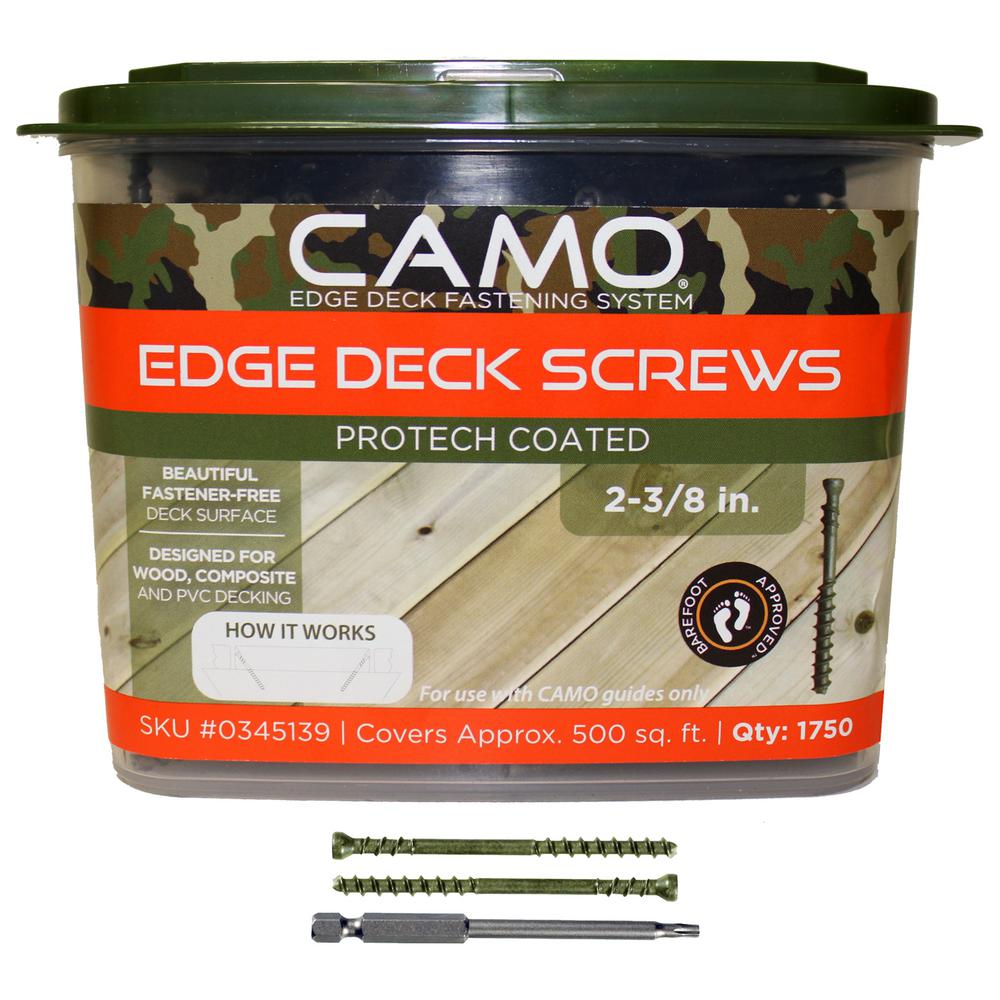The CAMO Edge Deck Fastening System works on most treated lumber, hardwood, cedar, composite or PVC deckboard. CAMO Edge Fasteners, a CAMO Marksman tool, and CAMO Driver Bits combine to deliver a fastener-free deck surface that makes getting the job easy and installing the deck even easier. The CAMO Edge Deck Fastening System is engineered to work exclusively together. Using other branded tools, fasteners or bits will impair performance and won't produce the desired results.